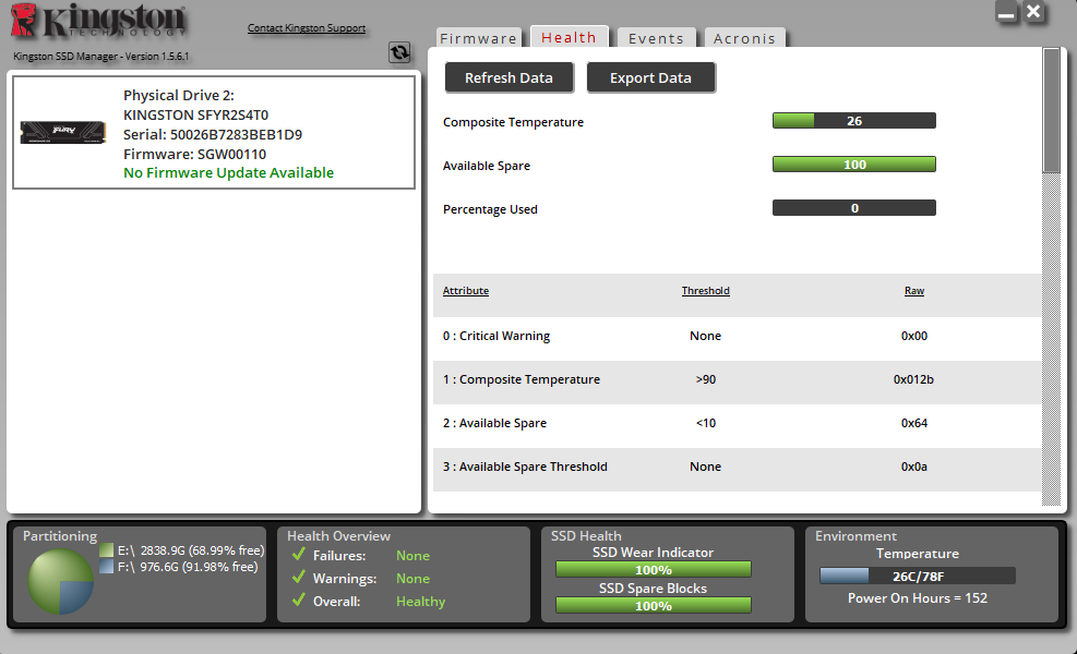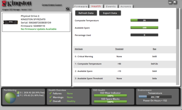 Mit dem Kingston SSD Manager stellt der Hersteller ein eigenes Verwaltungs- und Diagnose Tool für seine NVMe und SATA SSDs bereit. Die Software ermöglicht eine detaillierte Überwachung des Laufwerkszustands in Echtzeit. Dazu zählen unter anderem SMART Werte, Temperatur, verbleibende Lebensdauer, Firmware-Version sowie die aktuell genutzte und freie Speicherkapazität.