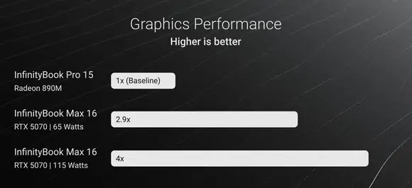 NVIDIA GeForce-Grafikkarten der gehobenen Mittelklasse in Gestalt der RTX 5060 und der rund 15 % schnelleren RTX 5070 bieten im InfinityBook Max 16 die etwa drei- bis vierfache* Grafikleistung im Vergleich zur im Prozessor integrierten Radeon 890M und qualifizieren das flache Linux-Businessnotebook für grafisch anspruchsvolle Arbeitsprozesse und PC-Spiele in hohen Qualitätseinstellungen.