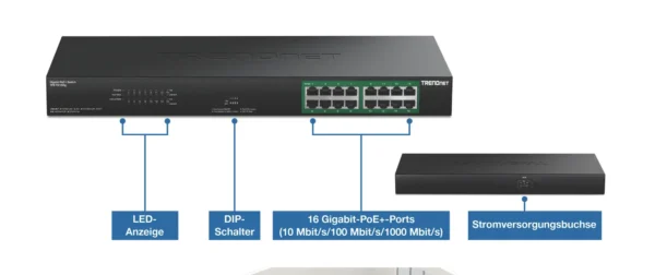 +++ 16 x Gigabit PoE+ Ports +++ 246W PoE-Gesamtleistung +++ 32 Gbit/s Schaltkapazität +++ Distanzerweiterung des PoE+-Signals auf bis 250 m mit 10 Mbit/s über Ports 1-8 +++ DIP-Schalter unterstützt VLAN-Port-Isolierung und Sturmkontrolle +++ intelligente Lüfter +++ reduzierte Ausrüstungskosten wegen Nutzung bestehender Netzwerkkabel +++ 1HE 19 Zoll rackmontierbares Gehäuse aus Metall, Halterungen inbegriffen +++ interne Stromversorgung +++ UVP 299,99 inkl. MwSt. +++