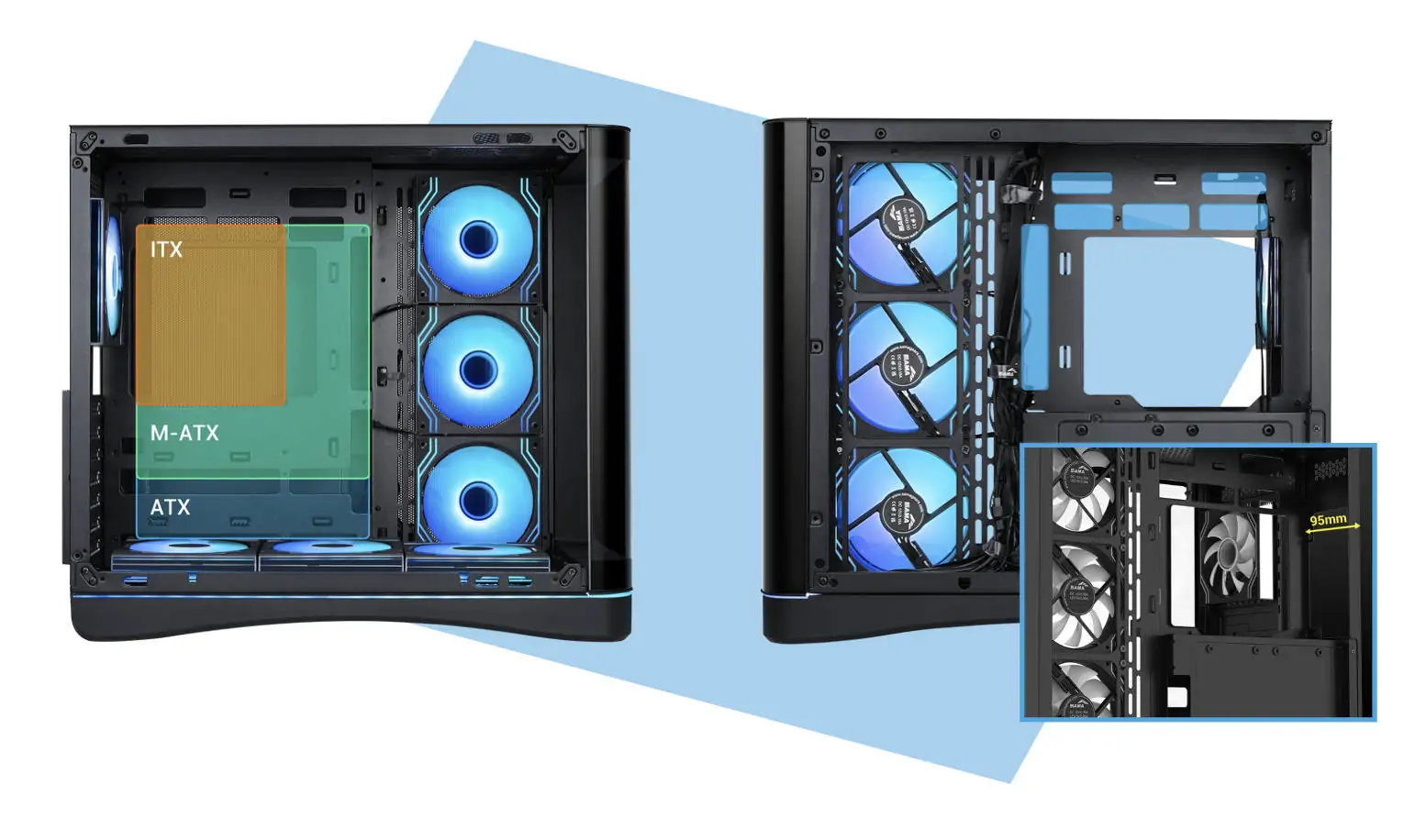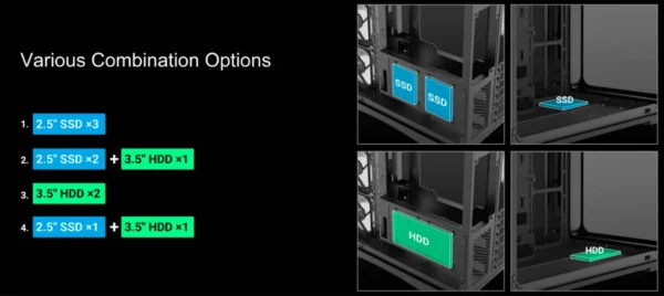 Der großzügige 95-mm-Kabelmanagementraum hinter dem Motherboard-Tray macht es einfacher, den Innenraum ordentlich zu halten, während die Unterstützung für bis zu zwei HDDs und drei SSDs praktischen Speicherplatz bietet, ohne den Innenraum zu überladen.