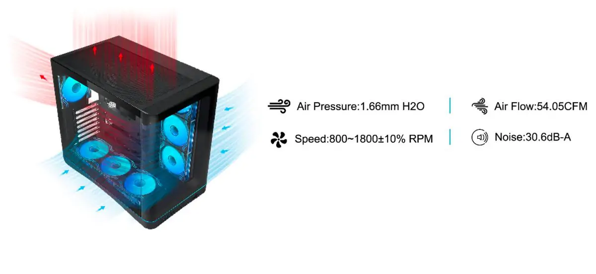 Sieben vorinstallierte ARGB-Lüfter sorgen für direkten Luftstrom und Beleuchtung, ohne dass zusätzliches Zubehör nötig ist. Jeder Lüfter hat einen Infinity-Mirror-Effekt, der für Tiefe und visuelle Bewegung sorgt und gleichzeitig ein klares, einheitliches Erscheinungsbild des gesamten Systems gewährleistet.