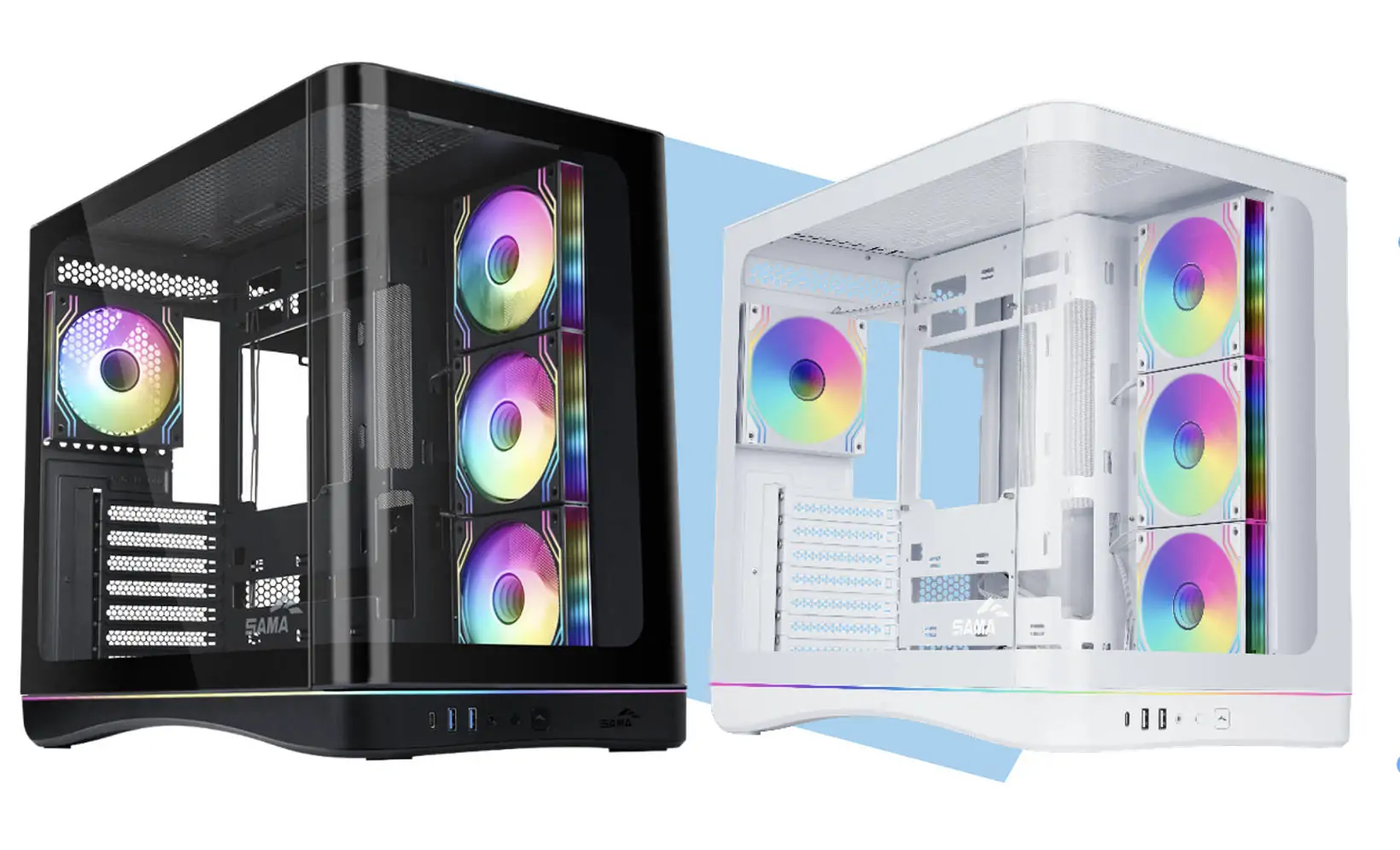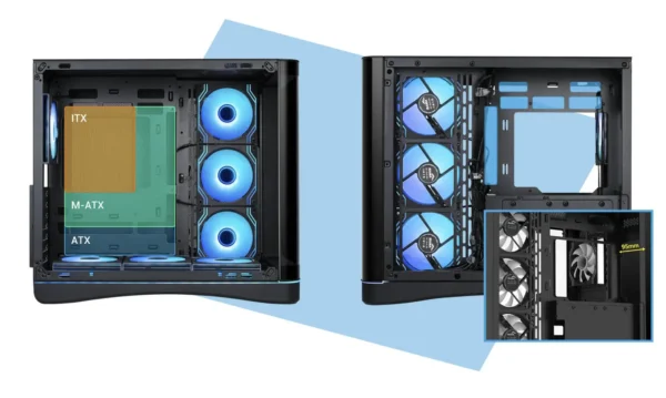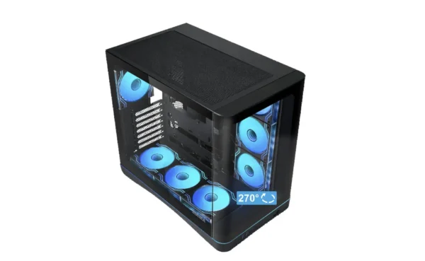 Durch die Kombination aus Panorama-Glasdesign, vorinstallierten ARGB-Lüftern, breiter Hardwarekompatibilität und durchdachtem Innenlayout bietet das SAMA V62 eine starke Balance zwischen Stil und Funktionalität. Es wurde für Leute entwickelt, die ein klares, auffälliges System wollen, ohne dass der Aufbau kompliziert wird.