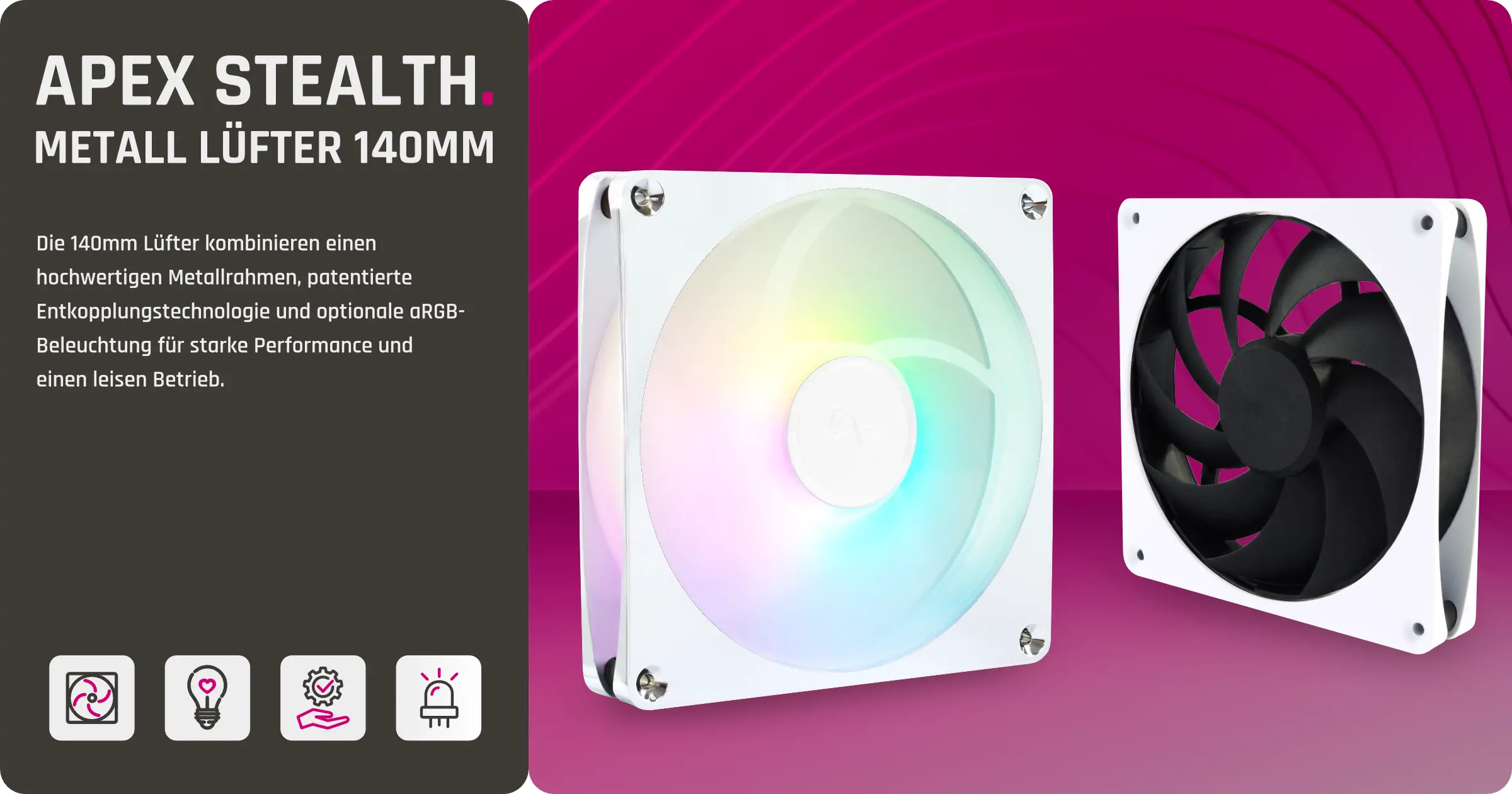 Praktische Features wie PWM-Steuerung, Daisy-Chain-Anschlüsse und eine saubere Kabelführung erleichtern Installation und Integration in bestehende Systeme. Die Apex Stealth 140mm Lüfter sind sowohl als ARGB-Version mit beeindruckenden Lichteffekten als auch als schlichte Non-aRGB Variante erhältlich und werden in den Farbvarianten Chrome, Weiß und Mattschwarz angeboten – so findet sich für jedes Systemdesign die passende Option.