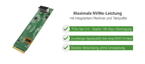 - Wandelt einen M.2 NVMe (PCIe Gen5 x4) Slot in einen MCIO 4i-Ausgang um