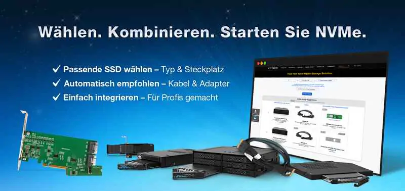 NVMe-Speicherauswahl-Tool – ein interaktives Tool, das Ihnen hilft, kompatible Wechselrahmen, Kabel und Adapter basierend auf dem NVMe-Slottyp Ihres Systems und den Installationsanforderungen zu finden.