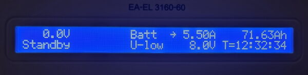 Über die Kfz-Steckdose habe ich bei 5,5 Ampere ebenfalls einmal die gesamte Powerstation über die elektronische Last entladen. Die stabilisierte Spannung an der Steckdose beträgt 12.5 Volt. Insgesamt konnten so 895 Wattstunden entnommen werden, was einem Wirkungsgrad von 90 Prozent entspricht.