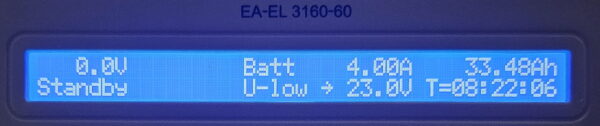 Über einen USB-C Trigger wird eine Spannung von 28 Volt eingestellt und mit Hilfe einer elektronischen Last die Powerstation von 100 auf 0 Prozent vollständig entladen. Als Entladestrom sind vier Ampere eingestellt. Insgesamt konnten so 937 Wattstunden entnommen werden, was einem Wirkungsgrad von 93-94 Prozent entspricht.