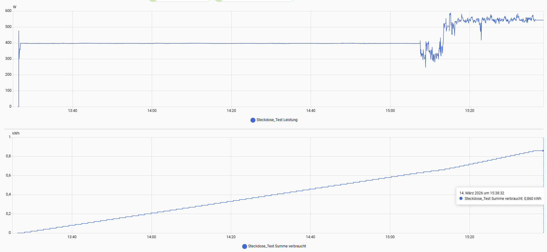 Ich verwende als Last die verwandte Ecoflow Delta 3 Max Plus, welche konstant mit 400 Watt nachgeladen wird. Die entnehmbare Kapazität durch den AC-Wandler ist stark von der Last abhängig, da der Wechselrichter selbst einen Eigenverbrauch hat, selbst wenn keine Last angeschlossen ist. Die Powerstation gibt ohne Last eine Laufzeit von 2,7 Tagen an, was einem Eigenverbrauch von etwa 15 Watt entsprechen würde und plausibel erscheint und stets auf die eigene Last draufaddiert werden kann. Beispielsweise ist das alleinige Betreiben einer LED-Lampe mit vier Watt sicherlich nicht optimal für die Laufzeit, hier wäre eine (eventuell selbst gebastelte) Lösung über USB deutlich effizienter.
