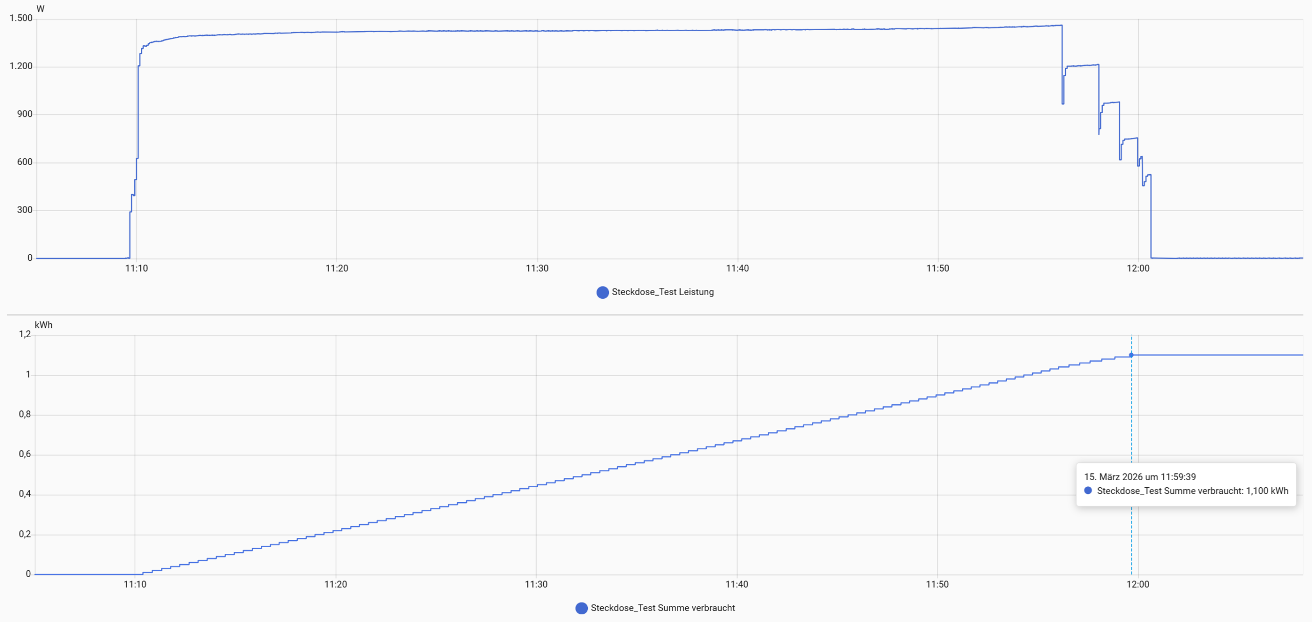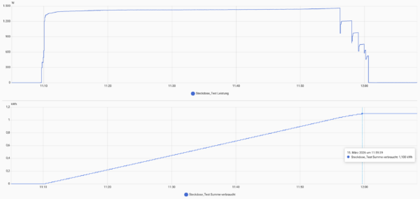 Ich starte auch bei der Ecoflow Delta 3 Plus wie gewohnt mit meinen Aufladetests über AC mit maximaler Ladeleistung. Über die App kann die Leistung zwischen 100 und 1500 Watt variiert werden. Bei 100 Watt funktioniert die Regelung aber nicht sehr gut, die Ladeleistung schwankt zwischen 70 und 120 Watt. Nach 51 Minuten war der Akku wieder gefüllt, die maximale Ladeleistung lag bei 1460 Watt und wurde gegen Ende in mehreren Stufen runtergeregelt. Insgesamt benötigt ein Ladevorgang 1100 Wh.
