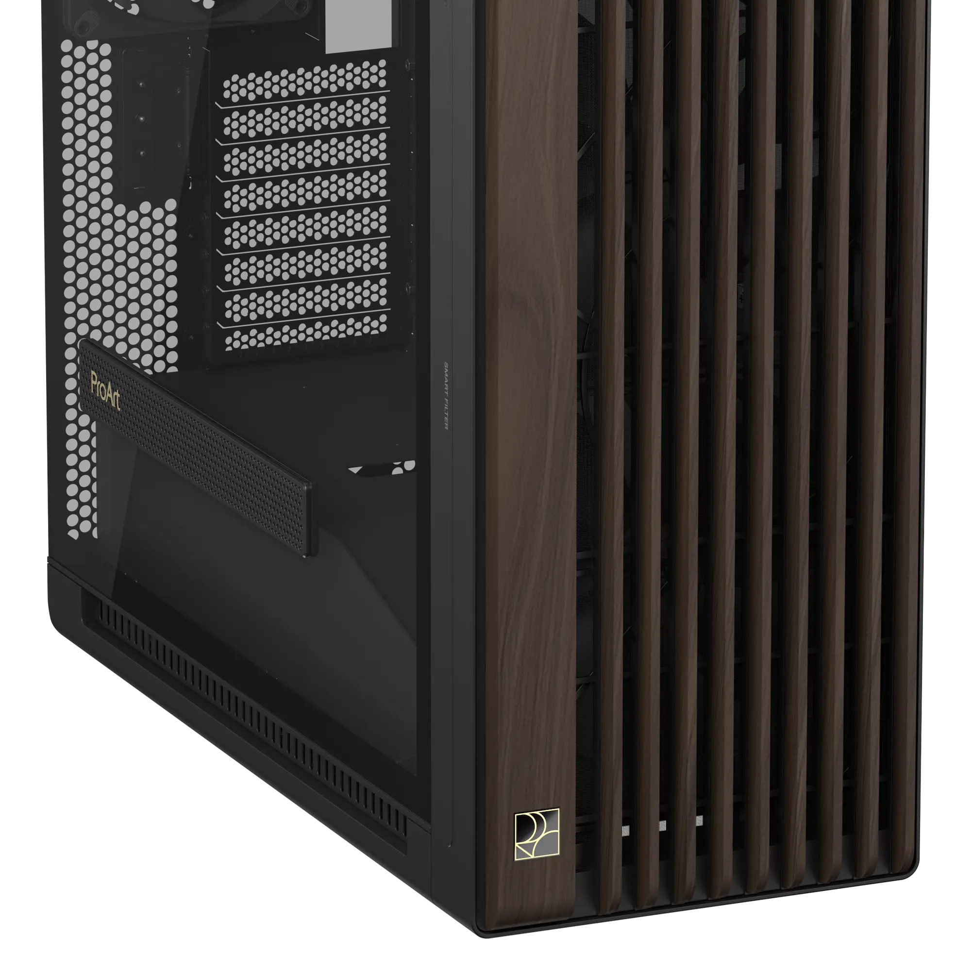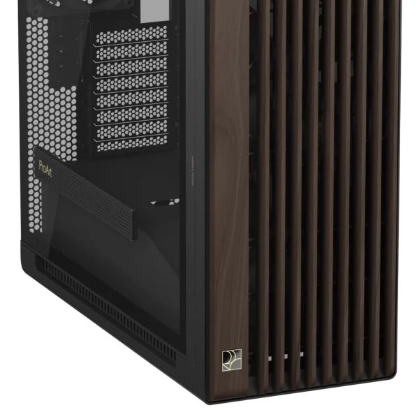 Bei der ProArt PA602 Wood Edition gibt es zwei Möglichkeiten für das Seitenteil. Eine Version umfasst eine Seitenwand aus Metall, bei der Kühleffizienz und Haltbarkeit im Vordergrund stehen. Die zweite enthält eine hochentwickelte Seitenwand aus gehärtetem Glas, die das Innenleben des PCs zur Schau stellt. Um die GPU mit noch mehr Kühlluft zu versorgen, verfügt das Tempered-Glass-Seitenteil über einen perforierten Einsatz, der die Lüfter der Grafikkarte noch tiefer atmen lässt.