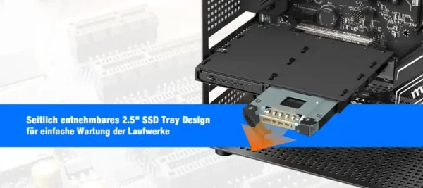 Zugriff auf Laufwerke direkt von der Seite des PCIe-Steckplatzes durch Öffnen der Gehäuseabdeckung, was einen schnellen Austausch und eine effiziente Nutzung des PCIe-Raums ermöglicht.