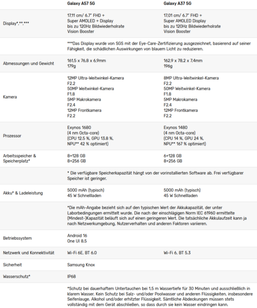 Das Samsung Galaxy A57 5G und das Galaxy A37 5G sind ab dem 10. April in Deutschland verfügbar. Das Samsung Galaxy A37 5G ist ab 429 € (UVP) erhältlich, das Galaxy A57 5G ab 529 € (UVP). Kund*innen, die bis zum 18. April bestellen, erhalten für beide Modelle ein kostenloses Speicher-Upgrade. Die 128-GB-Varianten werden dabei auf 6 bzw. 8 GB beim Samsung Galaxy A57 5G erweitert, die 256-GB-Modelle erhalten 8 GB zusätzlichen Speicher.