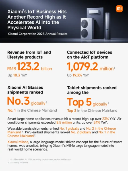 Das AIoT-Ökosystem von Xiaomi bewies 2025 erneut eine starke Dynamik. Die Gesamtzahl der vernetzten Geräte (ohne Smartphones, Tablets und Laptops) stieg um 19,3 Prozent auf einen neuen Rekordwert von 1.079,2 Millionen.