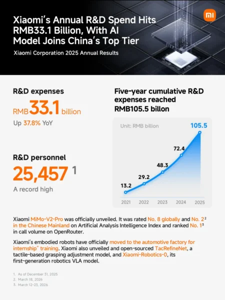 • Weiteres Rekordjahr für Xiaomi: Gesamtumsatz stieg 2025 um 25 Prozent auf 457,3 Milliarden RMB – bereinigter Nettogewinn wächst um 43,8 Prozent auf Rekordhoch von 39,2 Milliarden RMB.