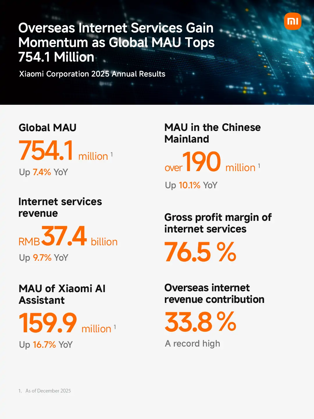 Die Zahl der Nutzerinnen und Nutzer mit fünf oder mehr vernetzten Geräten (ohne Smartphones, Tablets und Laptops) wuchs im Jahresvergleich um 23,6 Prozent auf 22,7 Millionen. Im Dezember 2025 stieg die Zahl der monatlich aktiven Nutzer*innen (MAU) der Xiaomi Home App um 11,7 Prozent auf 112,7 Millionen im Vergleich zum Vorjahr.
