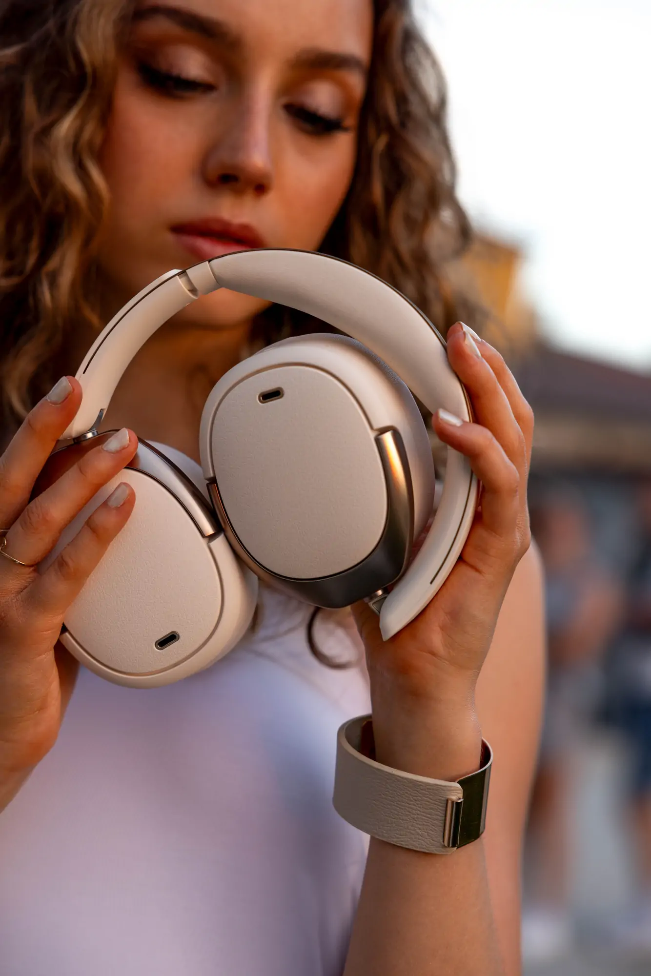 Für fokussiertes Hören reduziert die hybride aktive Geräuschunterdrückung Umgebungsgeräusche um bis zu -49 dB. Vier Mikrofone analysieren Störquellen in Echtzeit und blenden sie per optimiertem Algorithmus effektiv aus. Die Intensität ist in acht Stufen regelbar; zusätzlich stehen Transparenz- und Windgeräuschmodus zur Verfügung.