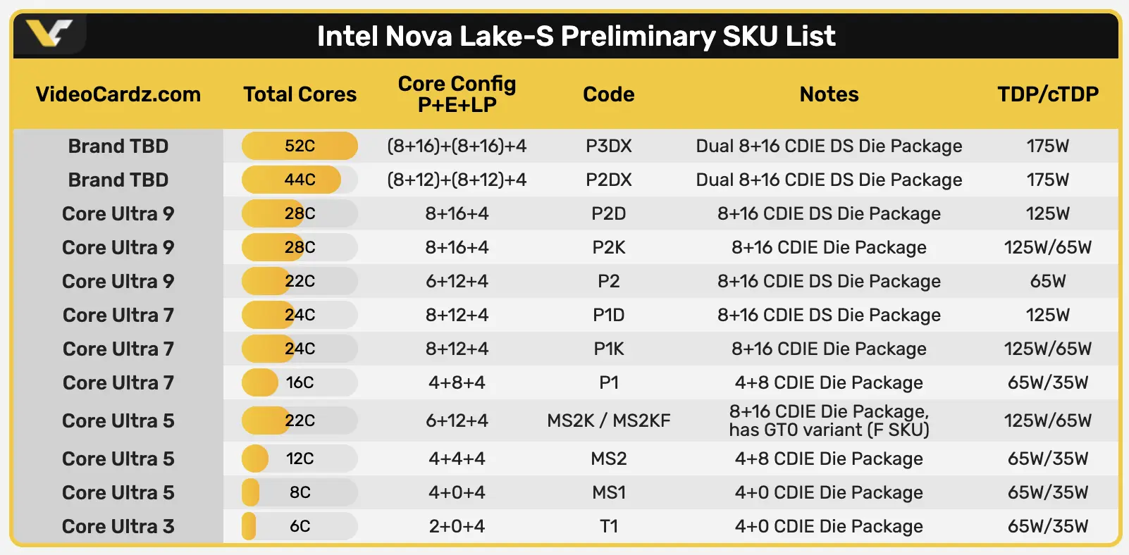 Ein besonders interessanter Aspekt ist die Einführung von bLLC („big Last-Level Cache“) – Intels Gegenstück zu AMDs 3D V-Cache. Das hatte sich bereits im Juli 2025 abgezeichnet, als berichtet wurde, dass Intel Nova Lake 10 bis 60 Prozent schneller werden soll. Hierbei kommt ein zusätzlicher Cache-Die im Package zum Einsatz, der den vorhandenen L3-Cache erweitert. Diese Technologie dürfte insbesondere in Gaming- und latenzsensitiven Anwendungen Vorteile bringen. Entsprechende SKUs sollen sich möglicherweise durch neue Namenszusätze von Standardmodellen unterscheiden.