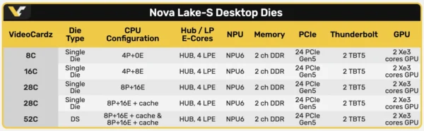 Alle Nova Lake-S SKUs werden mit einer einheitlichen Feature-Basis ausgestattet: NPU6 für KI-Beschleunigung (Copilot+ kompatibel), Unterstützung für Thunderbolt 5 / USB4 V2 (bis zu 120 Gbps), Dual-Channel DDR5 mit höheren Taktraten und größerer Kapazität sowie Unterstützung für 4-Rank DIMMs. Die integrierte Grafik basiert auf der neuen Xe3 „Celestial“-Architektur und soll trotz maximal zwei Xe-Kernen mindestens die Leistung der aktuellen „Alchemist“-iGPUs erreichen oder übertreffen.