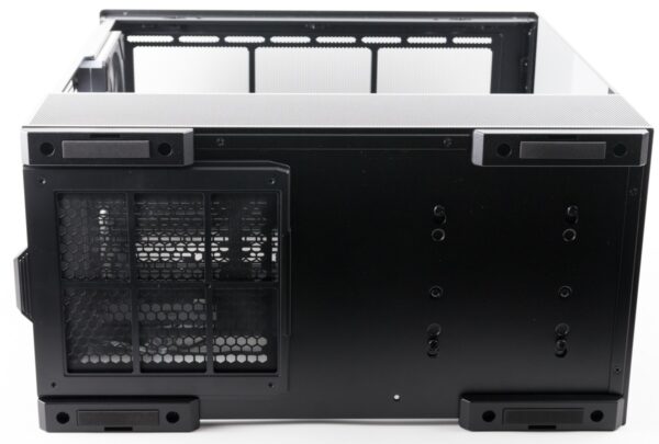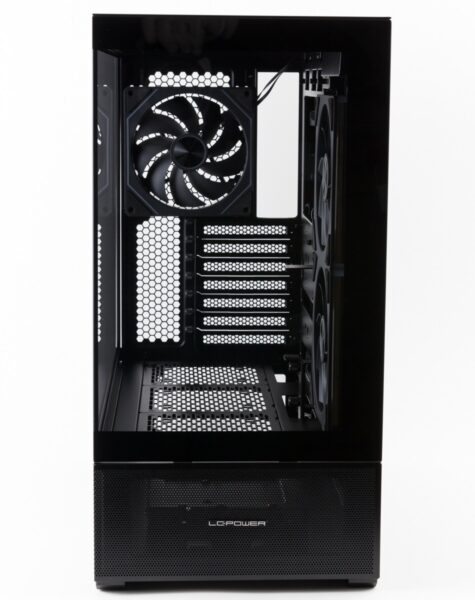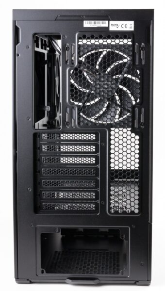 Die Rückseite besitzt zwei Löcher für Mainboardblende und Netzteil, Slotblenden sowie einen vorinstallierten Lüfter.