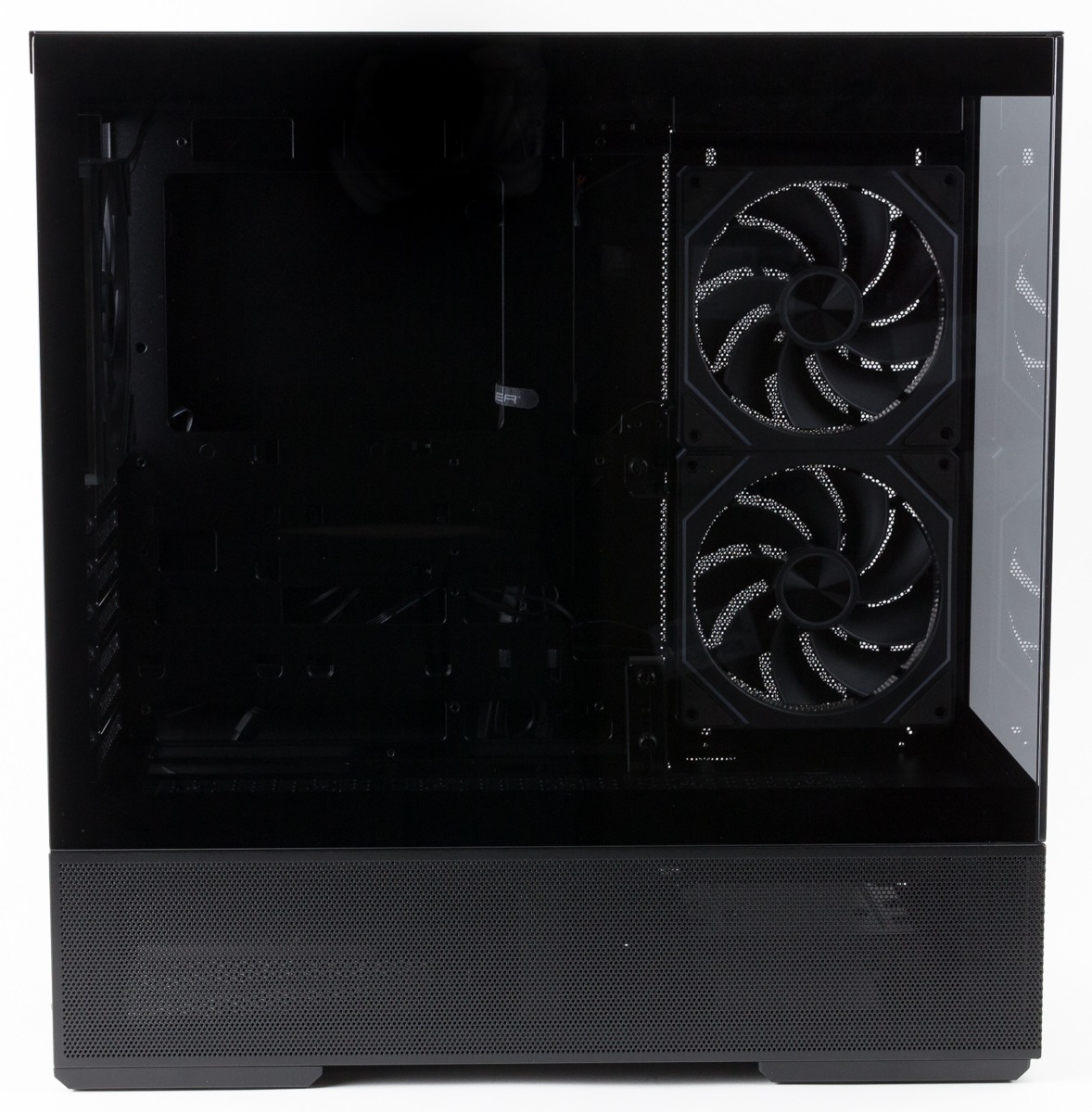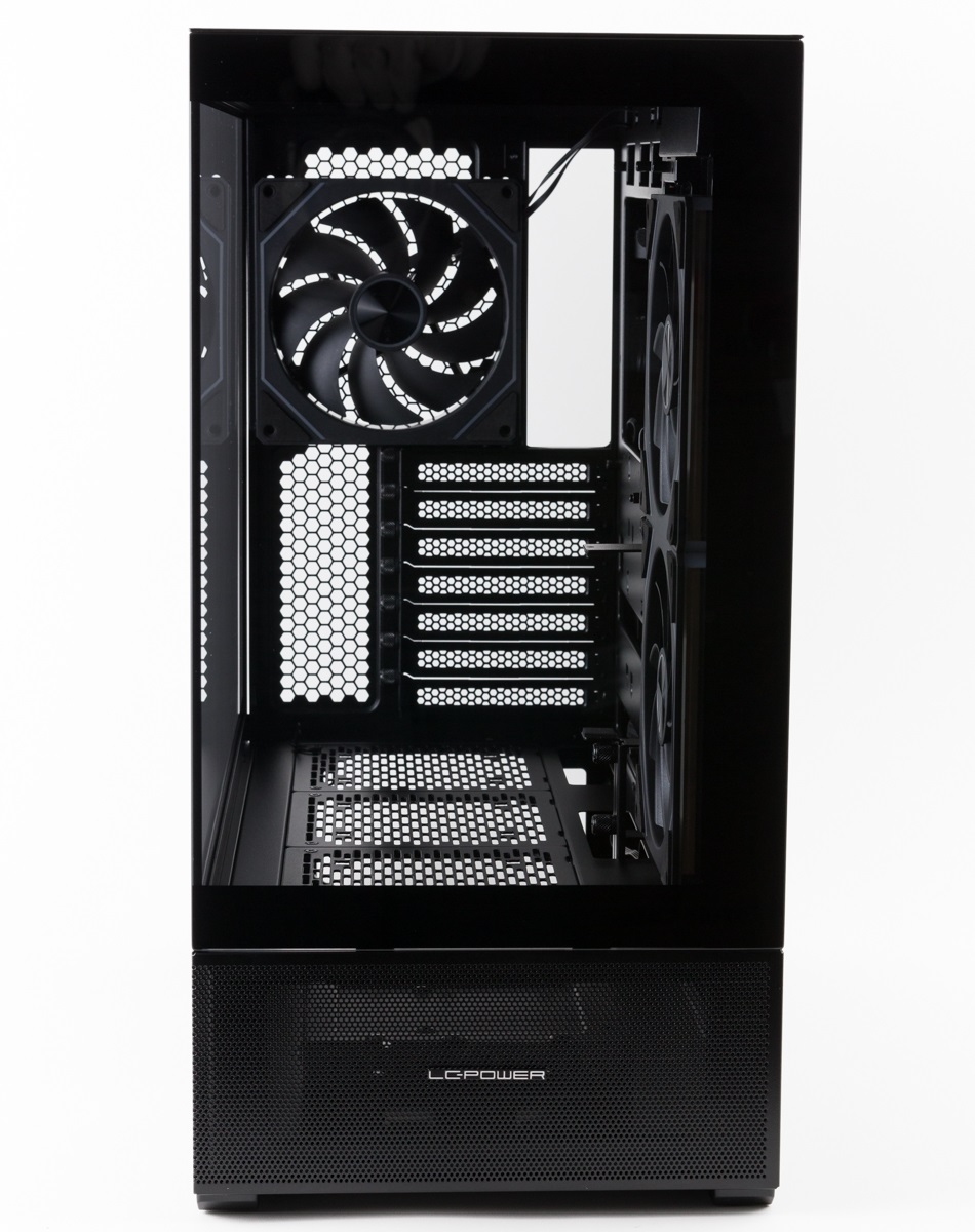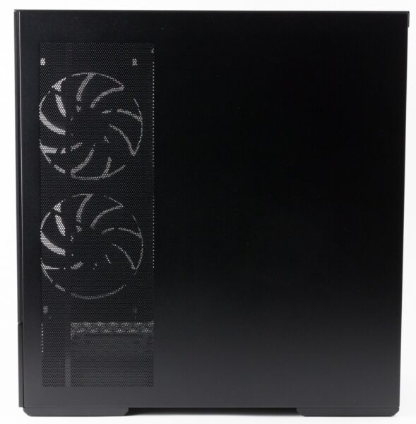 Das linke Seitenteil besteht im unteren Bereich aus feinem Meshgitter und oben aus Echtglas. Das rechte Seitenteil ist aus Metall und besitzt im vorderen Bereich viele feine Lüftungslöcher, hinter denen zwei vorinstallierte Lüfter sichtbar sind. Beide Seitenteile werden gesteckt und können daher zum Öffnen einfach abgezogen werden. Trotzdem hielten sie verschlossen ausreichend stark, wodurch keine zusätzlichen Schrauben benötigt wurden.