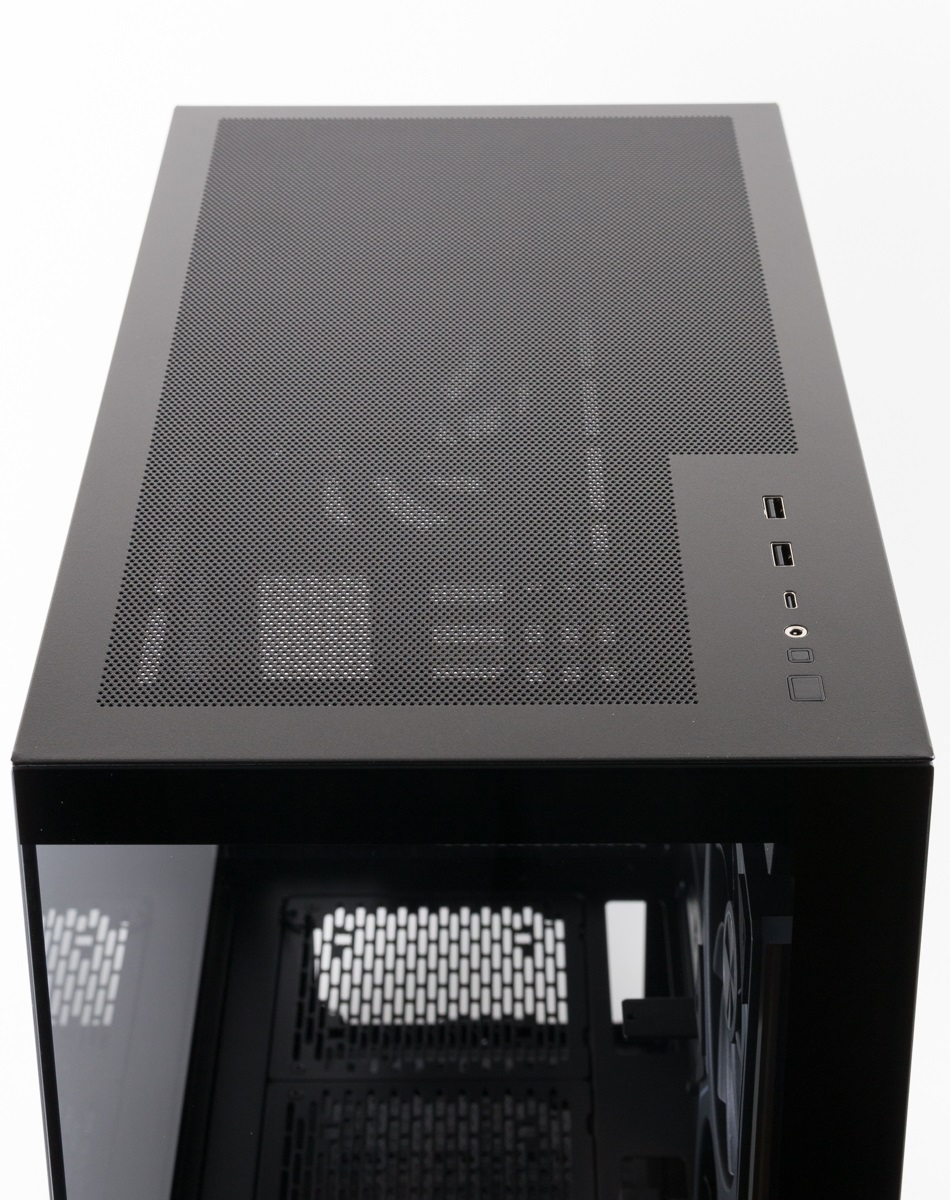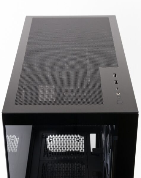 Das Top besitzt einen großen Bereich aus Meshgitter und vorne rechts zusätzlich einen Power- und Reset-Button sowie die Anschlüsse für Audio, USB-C und zweimal USB 3.0.