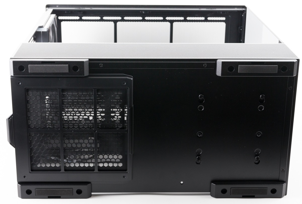 Die Unterseite besitzt vier gummierte, aber recht flache Standfüße. Sichtbar ist zudem der kleine entfernbare Staubfilter, der sich unter dem Netzteilplatz befindet.