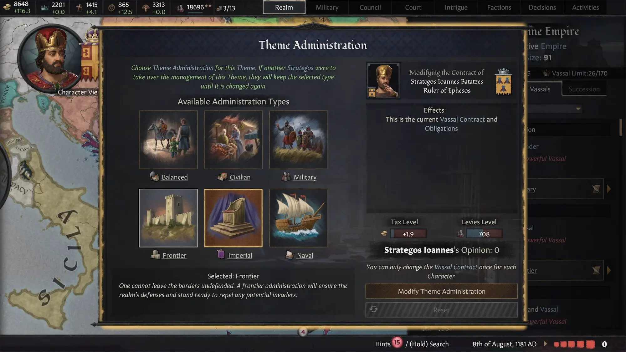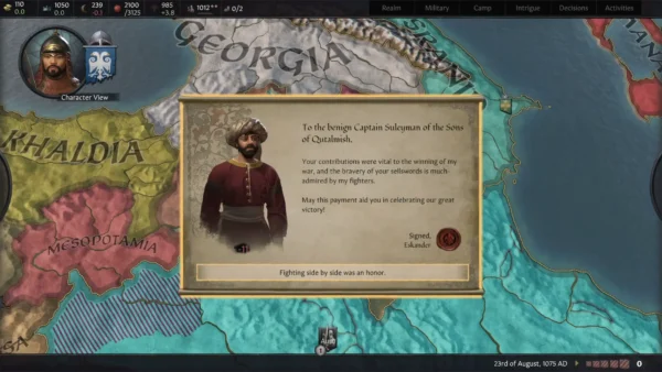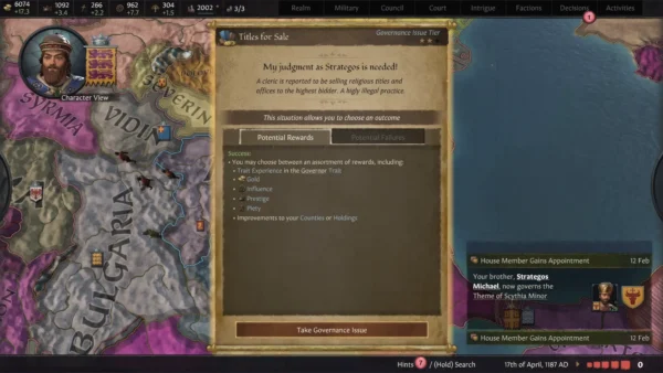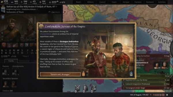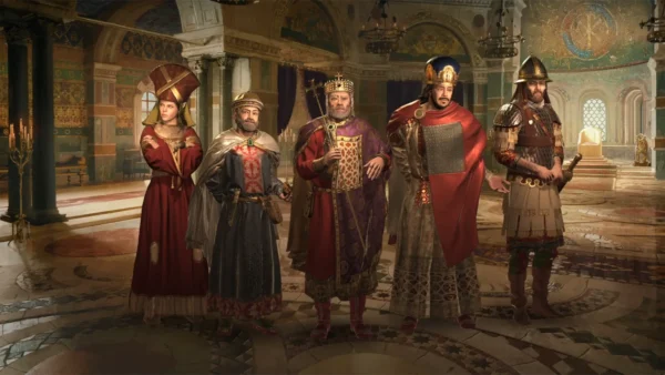 - Kosmetische Verbesserungen: Ein byzantinischer UI-Skin und neue höfische Kleidung für eure Charaktere, neue 2D-Ereignisgrafiken, neue Monumente der byzantinischen Welt auf der Karte, neue Haltedesigns auf der Karte und ein byzantinischer Thronsaal für königliche Hofsitzungen, neben anderen ästhetischen Verbesserungen. Neue Musik, inspiriert von orthodoxen Kirchengesängen, ist ebenfalls enthalten.