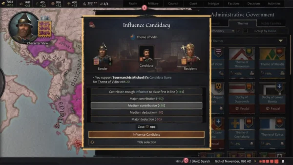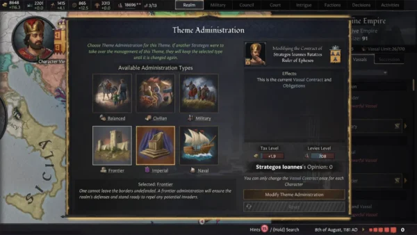 - Einflusssystem: Baue den Einfluss deines Charakters in einem Verwaltungsimperium aus, um in der Bürokratie aufzusteigen. Steigere deinen Status im Reich und erhalte mehr Macht. Beginne als landloser Adliger auf einem Landgut und kämpfe um wertvolle Provinzen, die du regieren kannst, bevor du um den Purpur kämpfst.