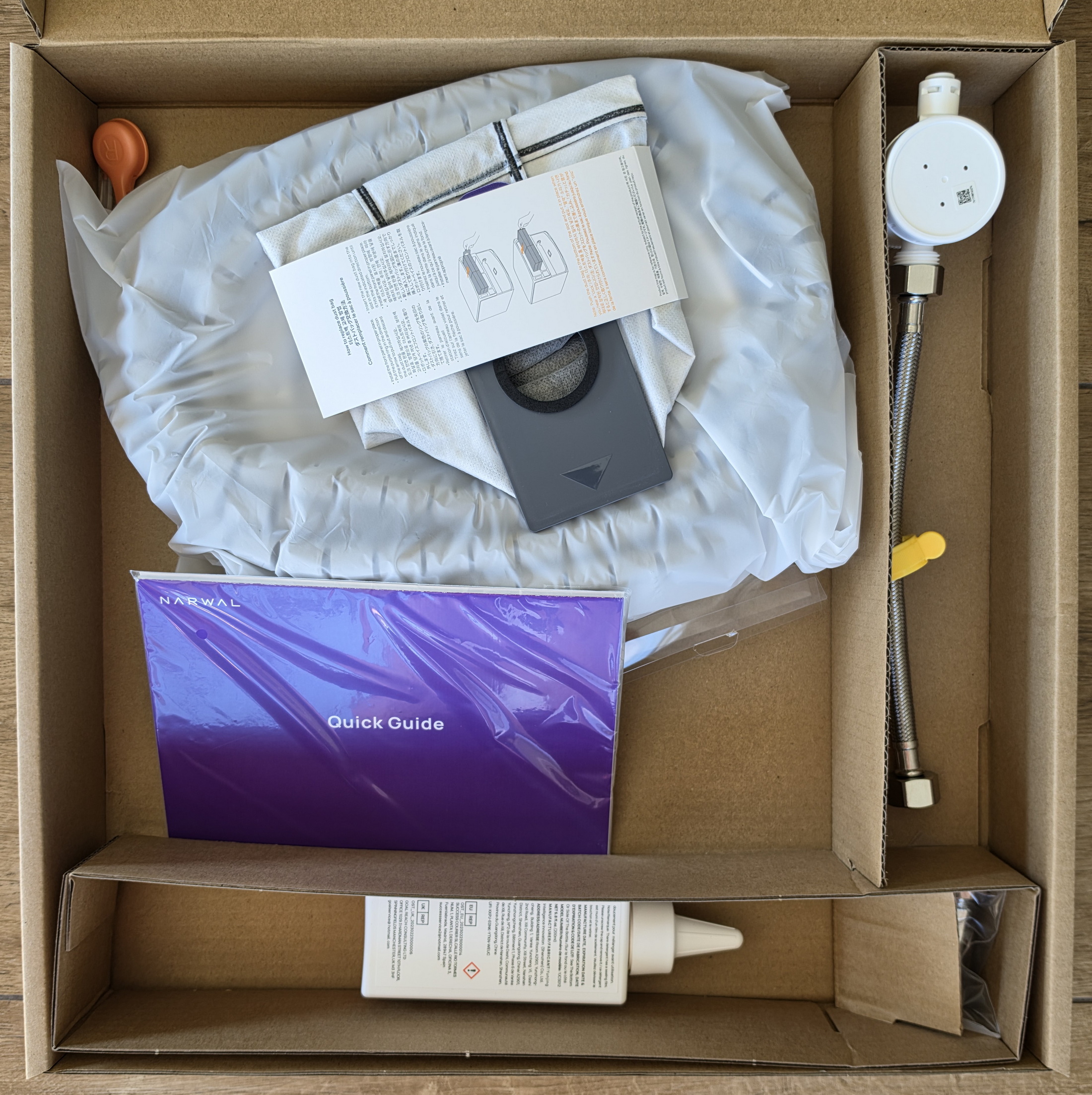 Der Roboter sitzt bei Lieferung schon in seiner Garage der Basisstation. Im Zubehörkarton ist daher viel Platz, den braucht es aber auch für die Schläuche und den Wasserfilter. Neben den Schläuchen ist auch hier eine Flasche Reinigungsmittel und ein Ersatz-Staubbeutel im Lieferumfang enthalten.
