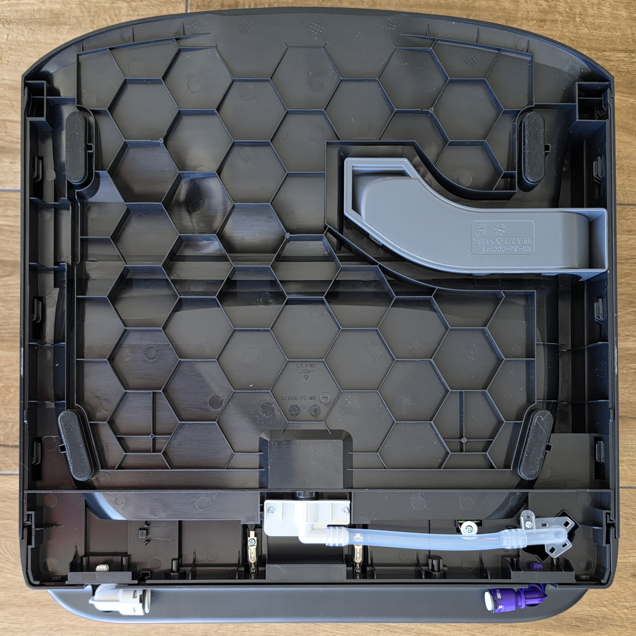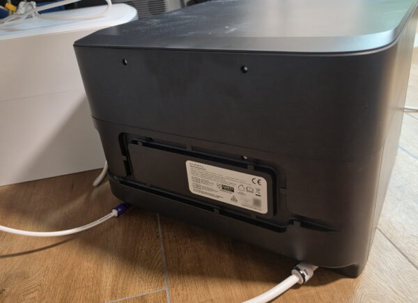 Der Anschluss an die Wasserleitung ist dank mitgeliefertem 1/2″-T-Stück kein Problem. Beim Abfluss sieht es etwas anders aus. Habt ihr einen Bodenabfluss in der Nähe, ist es sehr einfach. Ansonsten braucht ihr einen Geräteanschluss oder etwas Erfindungsgeist, wie ihr den Flow 2 sicher an das Abwasser anschließt. An der Station sind die Anschlüsse auf der Rückseite angebracht. Der dünne Schlauch auf der (von hinten) linken Seite ist für das Frischwasser, geht zum Wasserfilter und dann an die Wasserleitung. Der dickere Schlauch auf der rechten Seite geht direkt ins Abwasser. Links ist außerdem der Kaltgerätestecker für das Stromnetz.