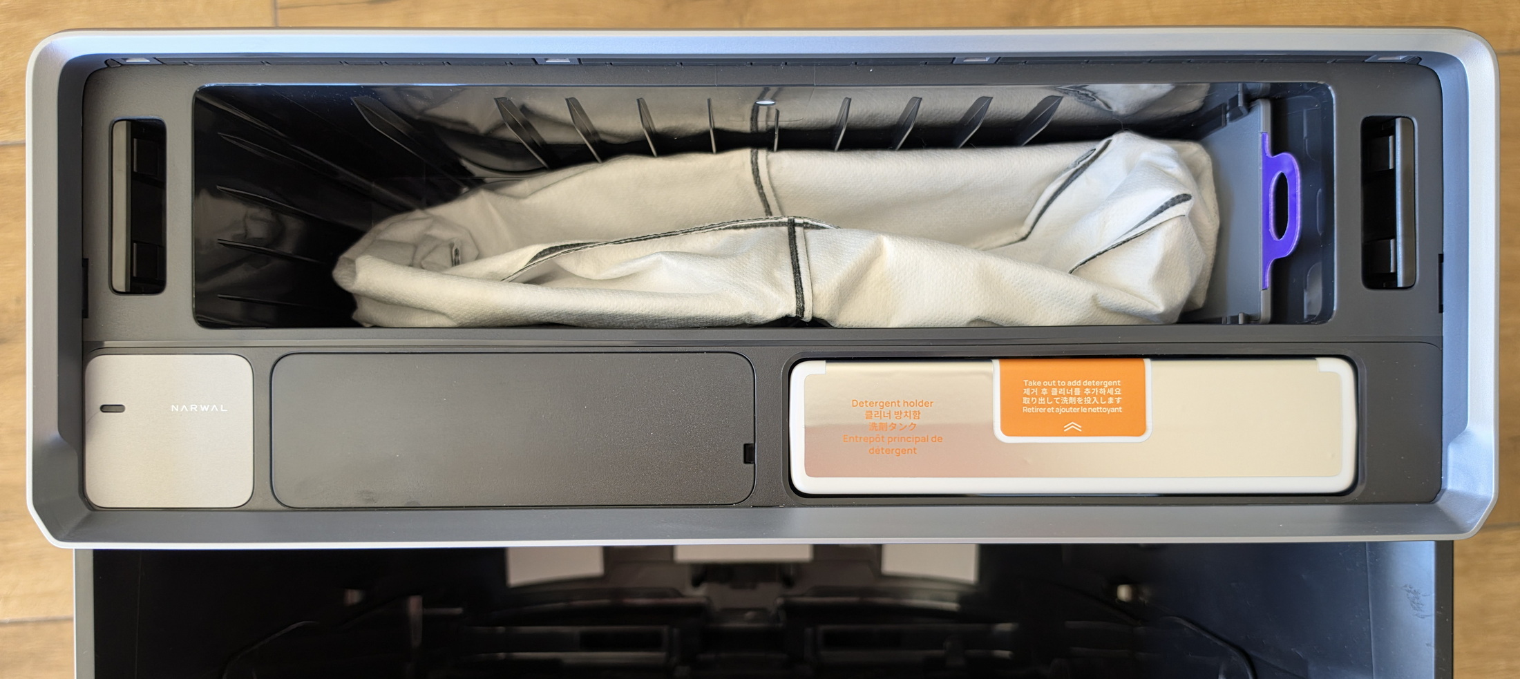 Wie beim Flow der ersten Generation befindet sich an der Front der Station eine Klappe, dahinter verbirgt sich der Reinigungsmittel-Tank und der Staubbeutel.