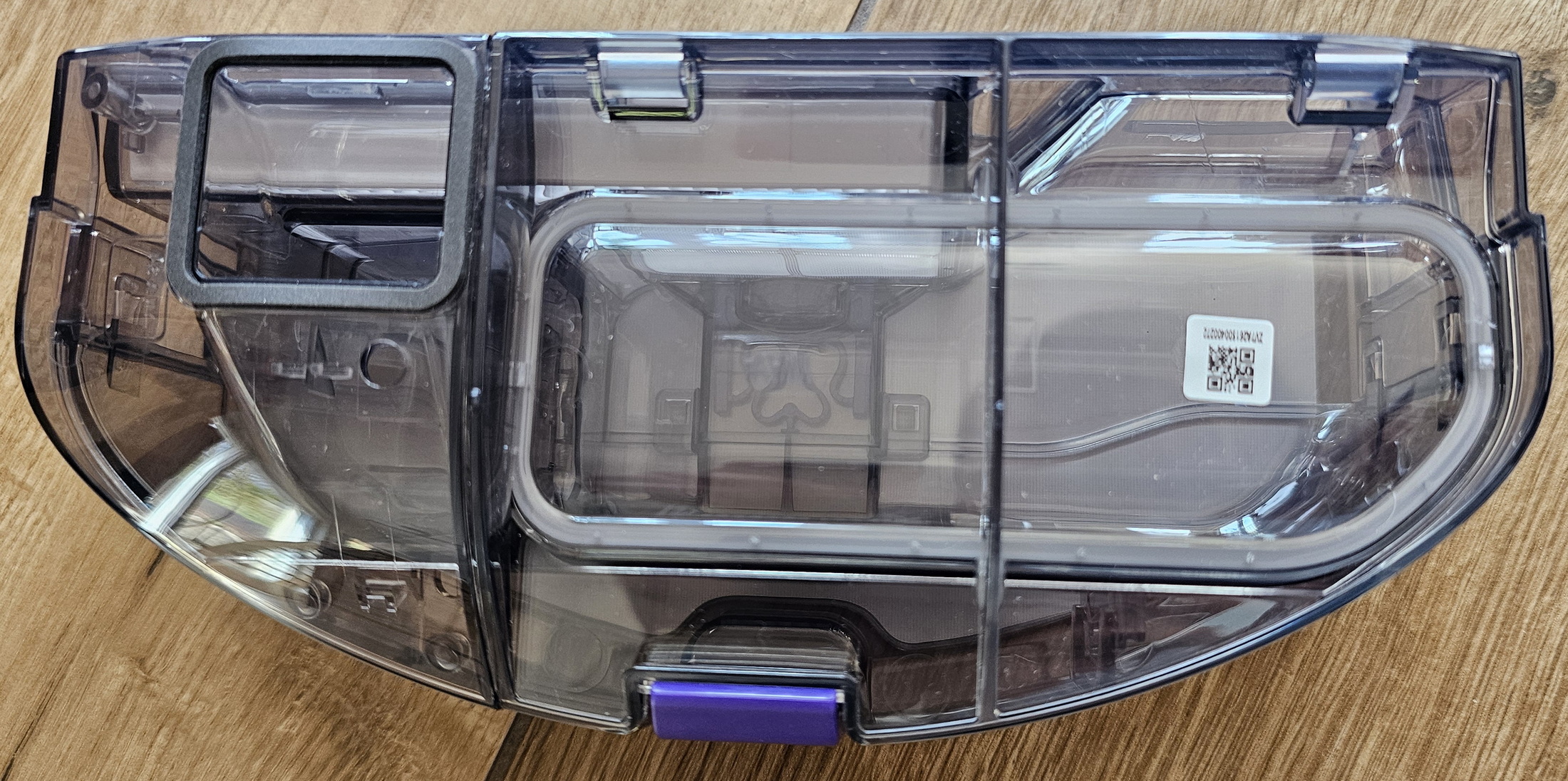 Das hohe Gewicht ist für das Wischen von Vorteil. Unter dem oberen Deckel befindet sich der Staubbehälter, welcher über die Station abgesaugt werden kann.