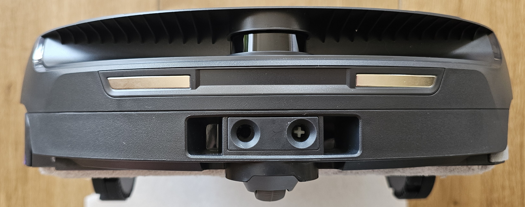 Neu beim Flow 2 ist der Verzicht auf die linke Seitenbürste, was sich im Test nicht als nachteilig herausgestellt hat. Das Gehäuse hat noch die Aussparung für die zweite Bürste, was die hohe Ähnlichkeit zum Flow 1 unterstreicht. Auf der Rückseite hat der Flow 2 von unten nach oben seine Wasserein- und Auslässe, die Ladekontakte und den Lidar-Sensor.