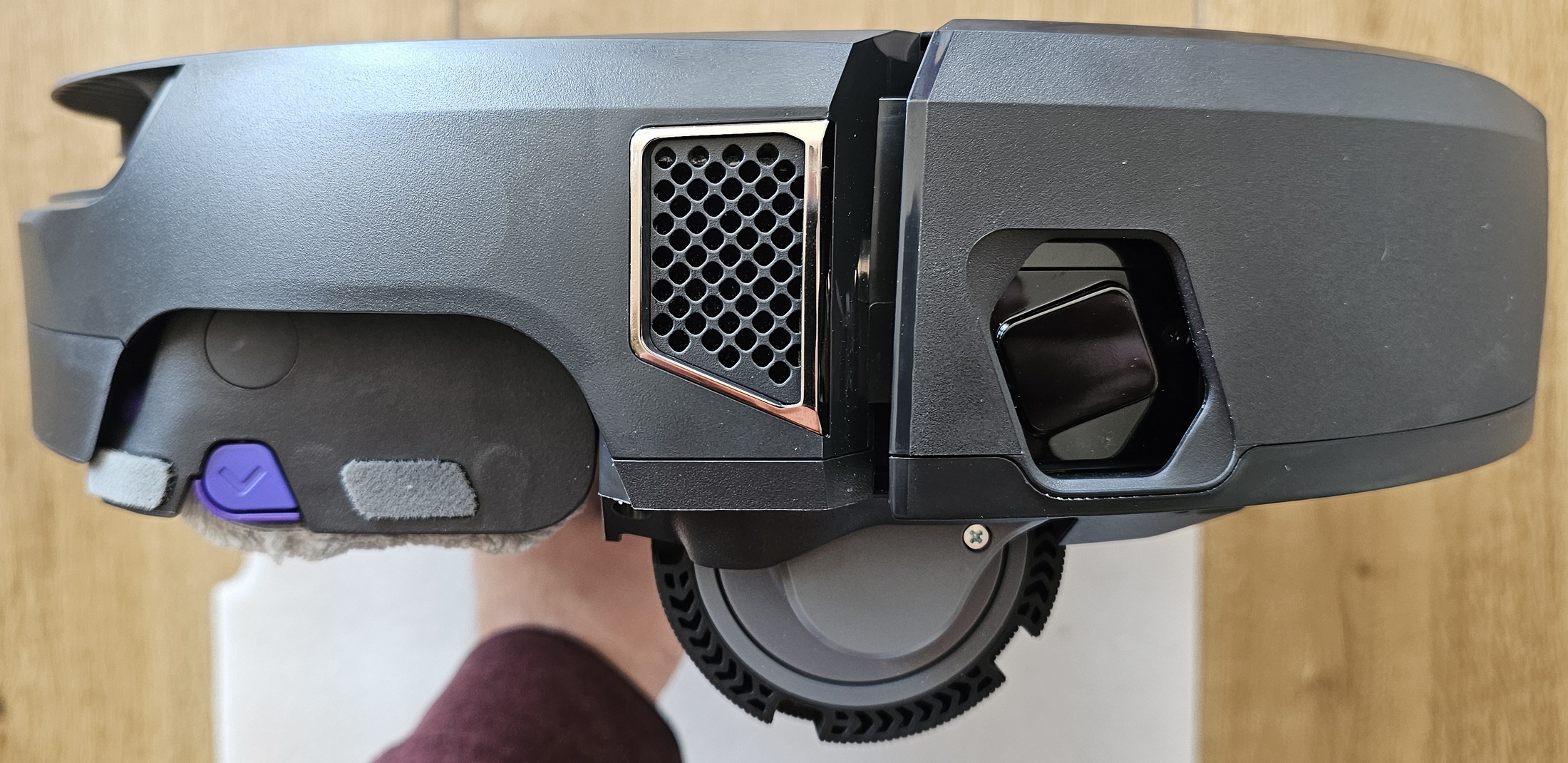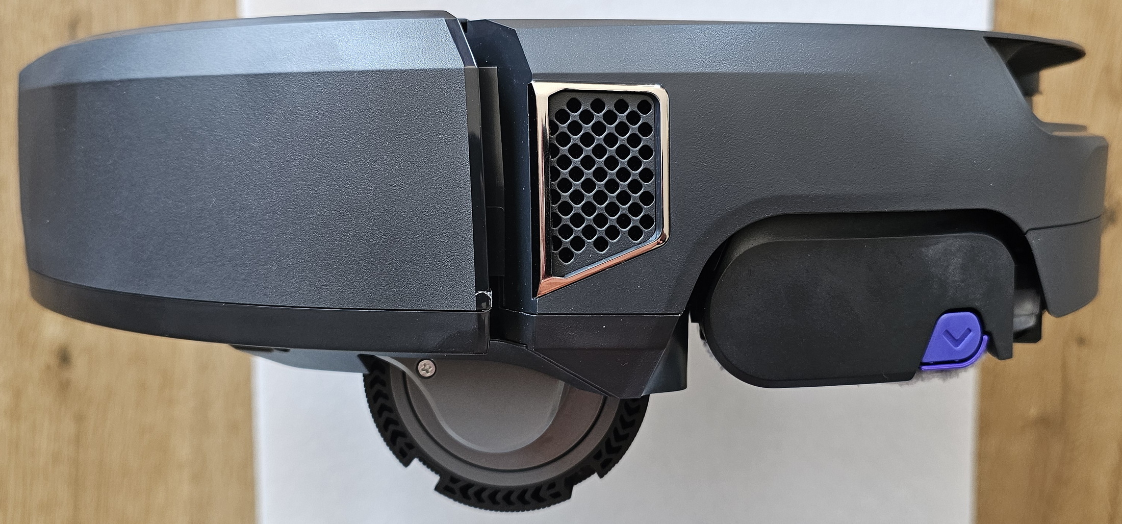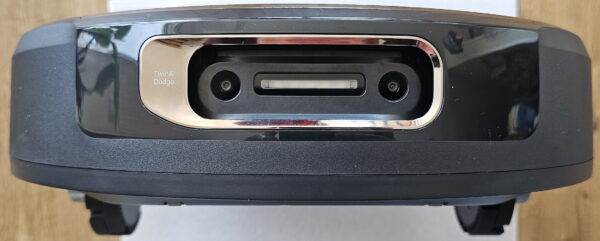 Auf der linken Seite gibt es einen Abstandssensor, auf der rechten Seite wie gewohnt keine Sensoren. Der Roboter ist mit 36,4×35,1 cm nahezu kreisrund und 95 mm hoch. Die Saugkraft beträgt mittlerweile 31 kPa auf der höchsten Stufe. Erfahrungsgemäß sollte man diesen Wert aber nicht überbewerten.