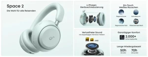 Die Over-Ear-Kopfhörer wiegen lediglich 261 Gramm. Für das ergonomische Design mit weicher Memory-Foam-Polsterung für maximalen Tragekomfort wurden mehr als 2.000 Kopfformen gescannt. Beim Active Noise Cancelling (ANC) liegt der Fokus gezielt auf tieffrequenten Störgeräuschen, wie sie etwa in Bus, Bahn oder Flugzeug auftreten. Das 4-stufige System zur Geräuschreduzierung ist auf genau diese Umgebungen ausgelegt. Für klaren Klang sorgen die 40 Millimeter großen Doppelschicht-Membrantreiber. Klangtechnisch haben die Space 2 viel zu bieten: So wird Hi-Res Audio per Kabel unterstützt, kabellos trumpfen sie mit dem hochwertigen LDAC-Standard auf.