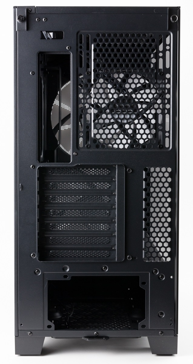 Die Rückseite besitzt zwei Löcher für Mainboardblende und Netzteil, Slotblenden sowie einen vorinstallierten Lüfter. Das Netzteil wird wie bei den meisten modernen Gehäusen also auf dem Boden platziert.