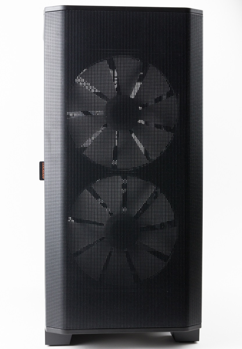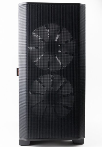 Die Front besteht vollständig aus feinem Meshgitter, hinter der man die beiden großen vorinstallierten Lüfter sehen kann. An der kleinen seitlichen Lasche ist der Staubfilter für die Front befestigt, über die man diesen leicht herausziehen und säubern kann.