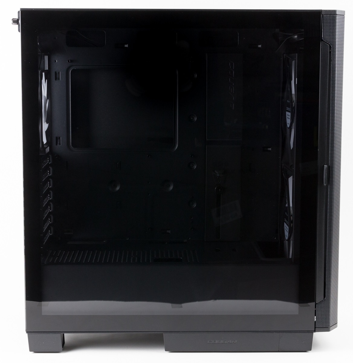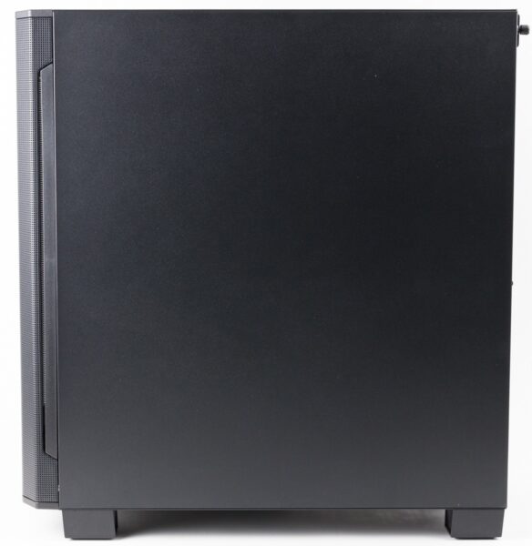 Das linke Seitenteil besteht fast vollständig aus Echtglas. Das rechte Seitenteil ist aus Metall und besitzt keine Lüftungslöcher oder andere Besonderheiten. Beide Seitenteile sind mit einer Thumb-Screw befestigt, werden aber grundsätzlich einfach seitlich abgezogen und können daher leicht entfernt und auch wieder befestigt werden.