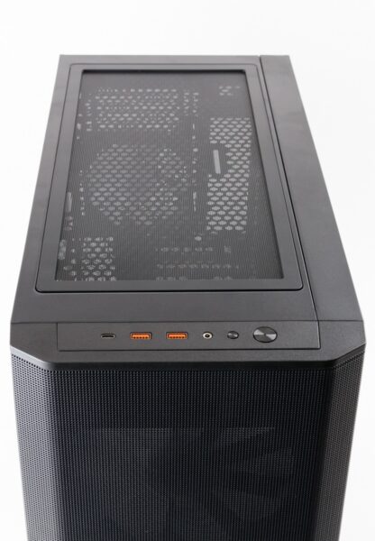 Das Top besitzt ebenfalls viele Lüftungslöcher mit einen großen Staubfilter. Im vorderen Teil befinden sich zusätzlich ein Power- und ein Reset-Button sowie die Anschlüsse für Audio, USB-C und zweimal USB 3.0.