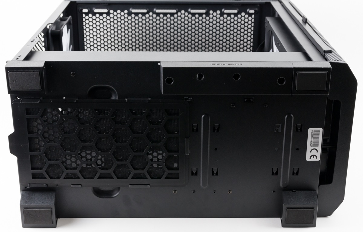 Die Unterseite besitzt vier große gummierte Standfüße und ebenfalls einen Staubfilter, der nach hinten abgezogen werden kann. Die recht dicke Einheit im oberen Bereich dient als Platzhalter für die Einheit, die die Anschlüsse im Top beherbergt. Alternativ können diese nämlich auch dort platziert werden.
