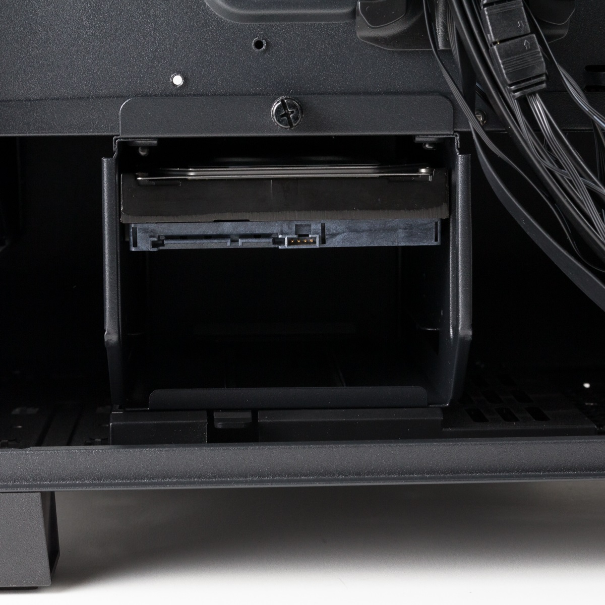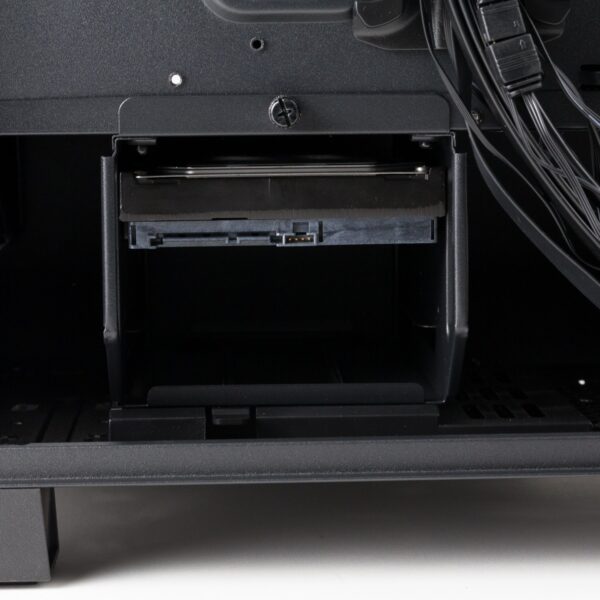 Im unteren Bereich befindet sich ein Festplattenkäfig, der nach dem Lösen einer Thumb-Screw bequem aus dem Gehäuse gezogen werden kann. In dem Käfig können zwei 3,5-Zoll-Festplatten verbaut werden. Allerdings gibt es keine Gummierungen oder eine andere Art der Entkopllung, wodurch Schwingungen an das Gehäuse übertragen werden könnten. Platz für SSDs wurde in diesem Bereich ebenfalls nicht geschaffen.