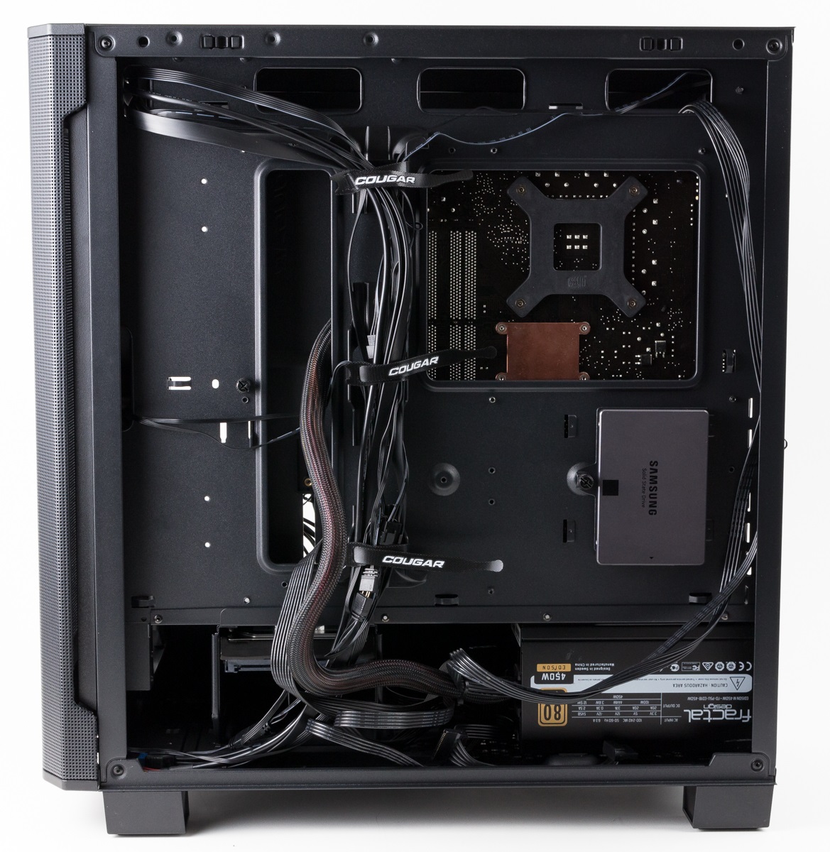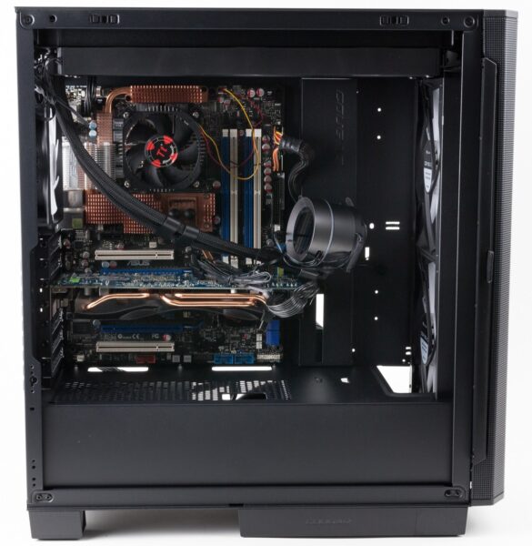 Gummierungen für die Kabeldurchführung gibt es nicht, allerdings eine Abdeckung, auf der auch die Halterung für schwere Grafikkarten installiert wurde, die Kabel etwas verstecken kann. Auf der Rückseite wurden zudem einige Mehrwegkabelbinder angebracht, die allerdings zum großen Teil von den gehäuseeigenen Kabeln genutzt werden. Viel Spielraum zum Verlegen steht auf der Rückseite nicht zur Verfügung, sodass sauber verlegt werden sollte, damit sich das rechte Seitenteil noch problemlos schließen lässt.