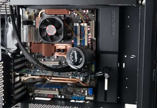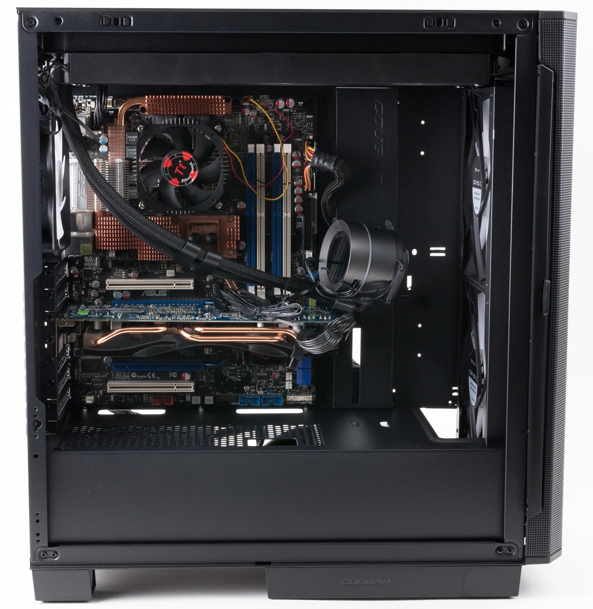 Für den Einbau des Mainboards waren beim Cougar Airface Flo RGB Abstandhalter für ein ATX-Mainboard vorinstalliert. Das Gehäuse nimmt aber auch CEB- oder E-ATX-Boards auf. Die Grafikkarte wurde mit üblichen Schrauben befestigt.