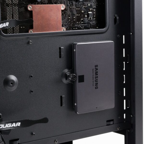 Eine SSD kann auf der Halterung hinter dem Mainboard verschraubt werden. Dort ist Platz für eine weitere SSD und die Vorrichtung für die Befestigung einer weiteren Halterung ist ebenfalls vorhanden, nur leider wird keine zweite Halterung mitgeliefert. Dies ist vor allem deswegen ärgerlich, weil im Festplattenkäfig keine SSDs verbaut werden können. Daher steht praktisch nur ein SSD-Platz im gesamten Gehäuse zur Verfügung.