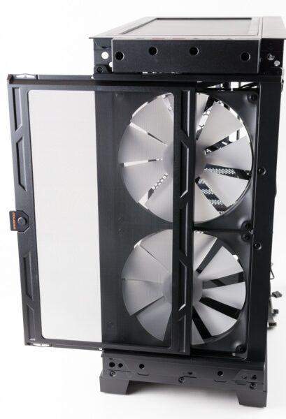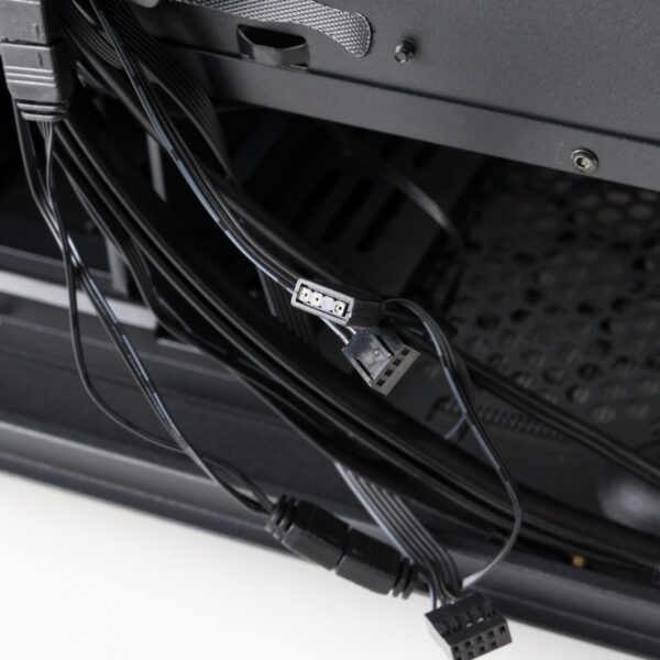 Die drei vorhandenen Lüfter wurden bereits in Reihe geschaltet und können daher über jeweils nur einen Anschluss über das Mainboard gesteuert werden. Dies betrifft sowohl die Lüftergeschwindigkeit als auch die Beleuchtung. Beide sind leider nicht über das Gehäuse steuerbar. Vor allem für die Beleuchtung wird daher ein kompatibles Mainboard benötigt, da die Lüfter ansonsten dunkel bleiben.