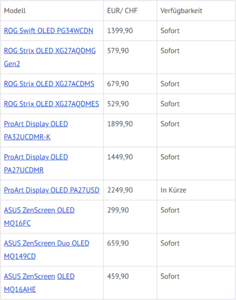 ASUS OLED-Monitore sind in Deutschland, Österreich und Schweiz zu folgenden unverbindlichen Preisempfehlungen inkl. MwSt. im Fach- und Onlinehandel erhältlich:
