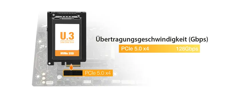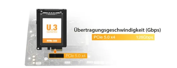 - PCIe 5.0 x4 Schnittstelle, bis zu 128 Gbps Bandbreite (abhängig von der SSD Geschwindigkeit)