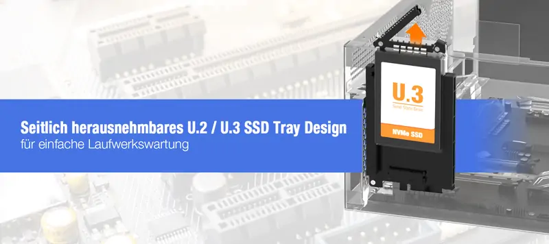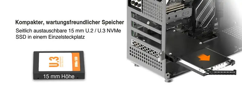 Die Unterstützung von 15 mm Laufwerken ist besonders wertvoll für Anwender, die SSDs mit höherer Kapazität oder Enterprise U.2/U.3 SSDs einsetzen, bei denen Ausdauer und konstante Leistung im Vordergrund stehen.