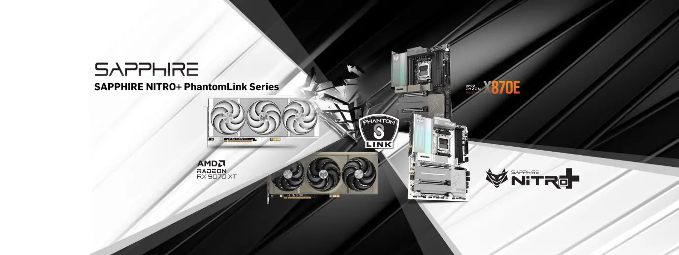 Das Ökosystem besteht aus der SAPPHIRE NITRO+ AMD Radeon RX 9070 XT PhantomLink Edition Grafikkarte und dem SAPPHIRE NITRO+ X870EA PhantomLink Edition Motherboard.