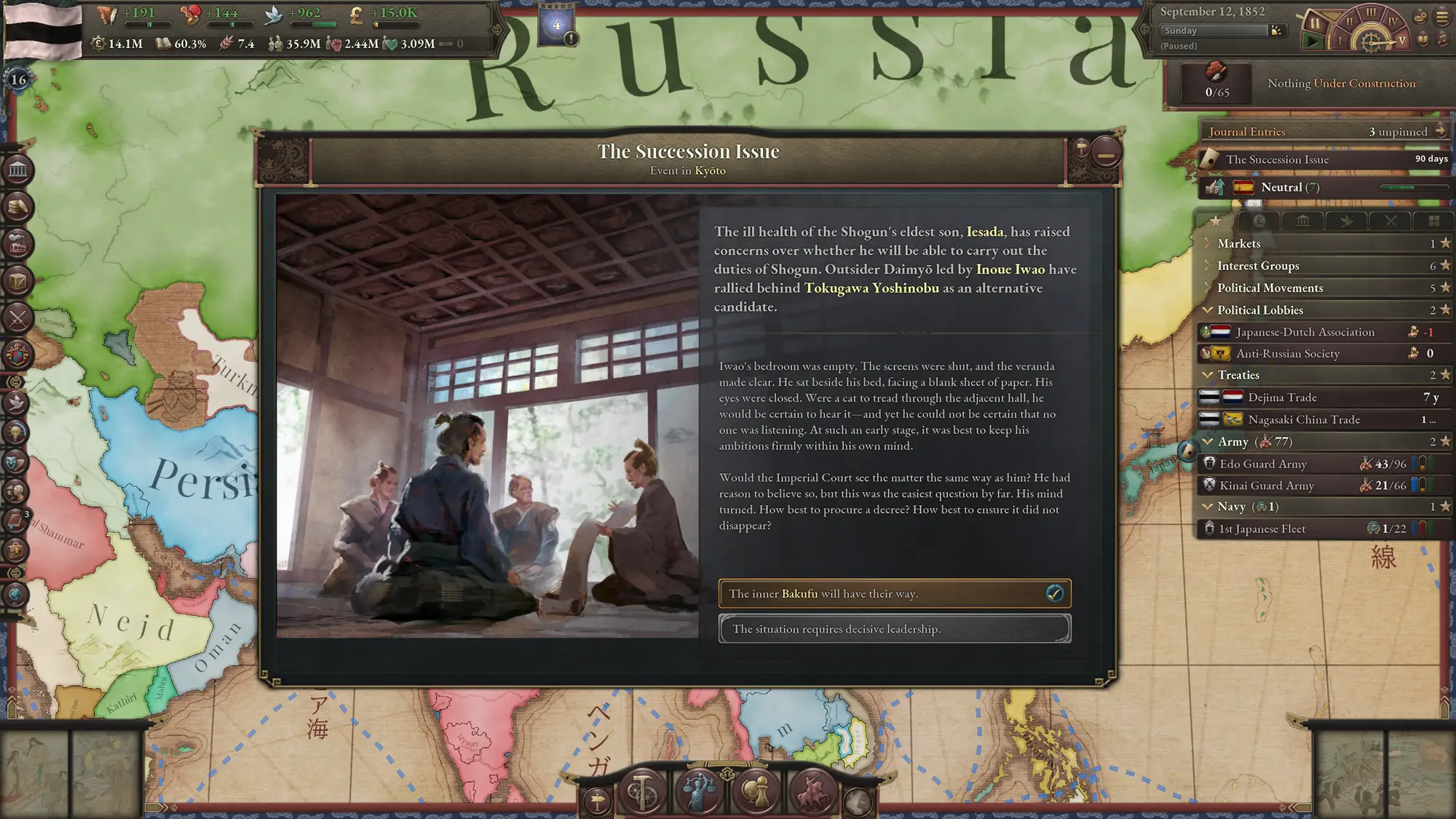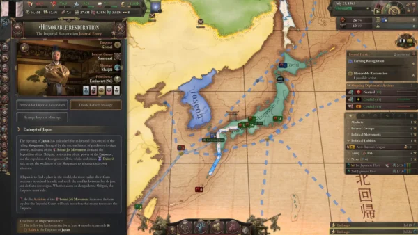 - Die Spielerinnen und Spieler steuern Japan durch die sozialen und politischen Unruhen der späten Edo-Zeit. Diese sind gekennzeichnet durch zunehmende Herausforderungen für die Herrschaft der Tokugawa-Samurai. Sie passen sich an die sich verändernde innen- und außenpolitische Lage an, lehnen sich dagegen auf oder reformieren das Land, um ihre Vision zu verwirklichen.